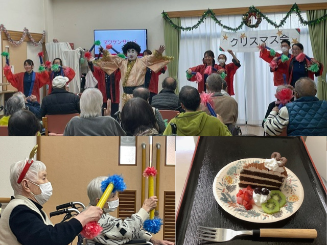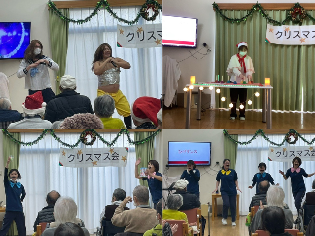 松本デイサービスセンター国分では毎年恒例のクリスマス会を行いました。職員による出し物は、懐かしの「ピンクレディー」「ひげダンス」や「ハンドベル」など盛りだくさんでした。