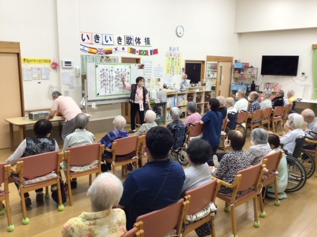 今日のレクリエーションは「いきいき歌体操」の方に来ていただき、歌に合わせて体を動かしました。歌に合わせて体を動かすと脳の活性化につながるそうですね。利用者のみなさんも楽しんでおられました。