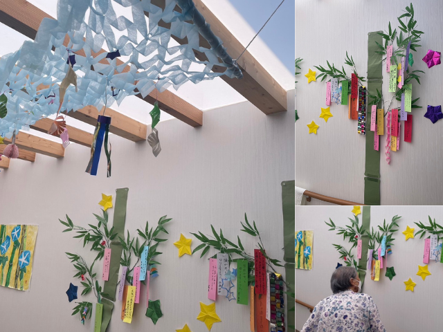 七夕にむけて利用者の皆様に短冊に願いを書いて頂き、お風呂につながる渡り廊下に飾りました。皆さんの願いが叶うといいですね。